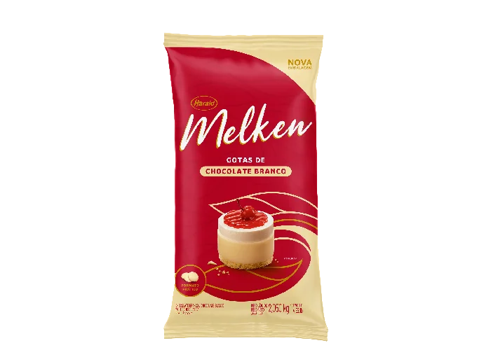 Na embalagem de 2,05kg, o produto inclui exclusivamente as gotas de chocolate branco Melken, prontas para uso imediato.